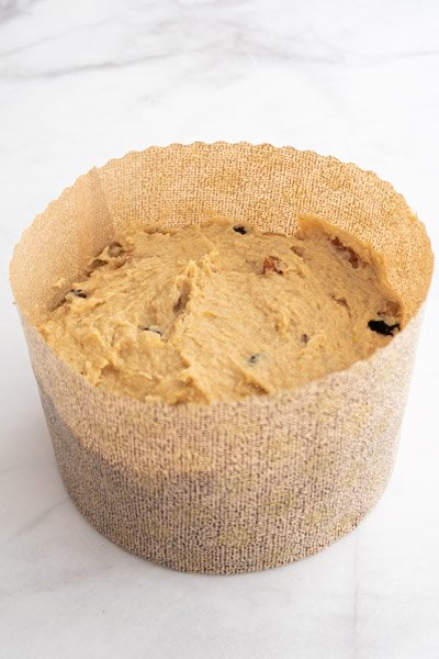 - Transfer the panettone batter evenly inside a 500 ml panettone mold, filling it up to 3/4 of the mold’s capacity. In case you don’t have a panettone mold, you can use a greased 8-inch round pan instead. However, keep in mind that the panettone will be wider than taller.