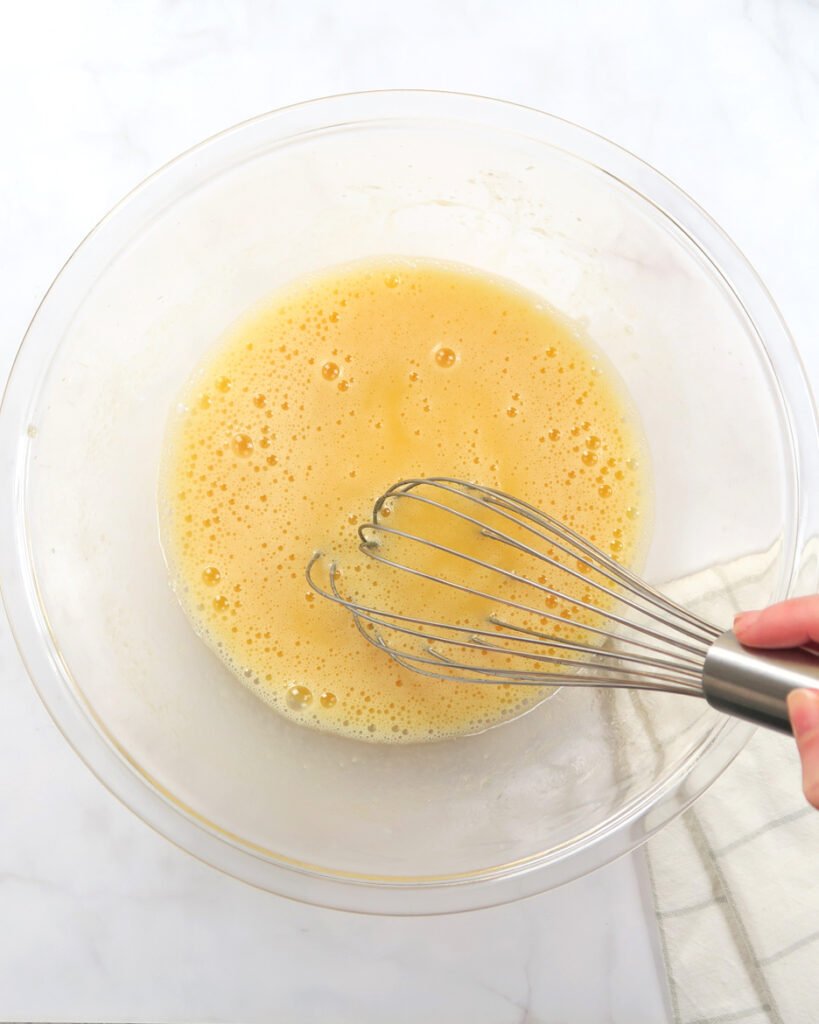 - Wymieszaj mokre składniki – w osobnej misce roztrzep jajka, białka jaj, oliwę z oliwek, miód oraz ocet jabłkowy. Mieszanka powinna być jednolita.