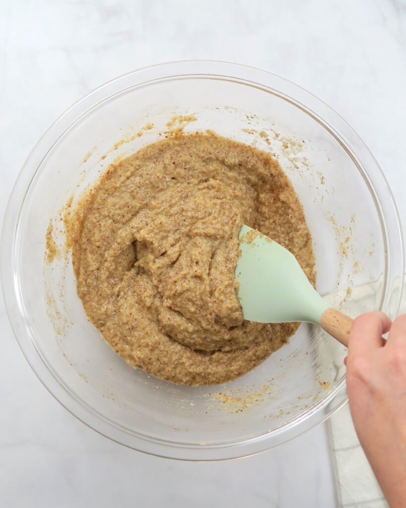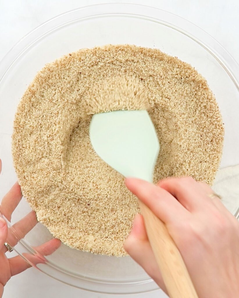- Wymieszaj suche składniki – w misce połącz mąkę migdałową, proszek do pieczenia, sodę oczyszczoną, sól oraz zmielone siemię lniane. Dokładnie wymieszaj, aż składniki równomiernie się połączą.