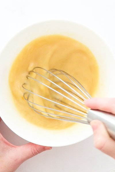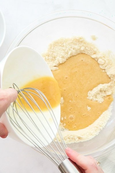 • W osobnej misce wymieszaj mleko migdałowe, jajka, miód i wanilię.